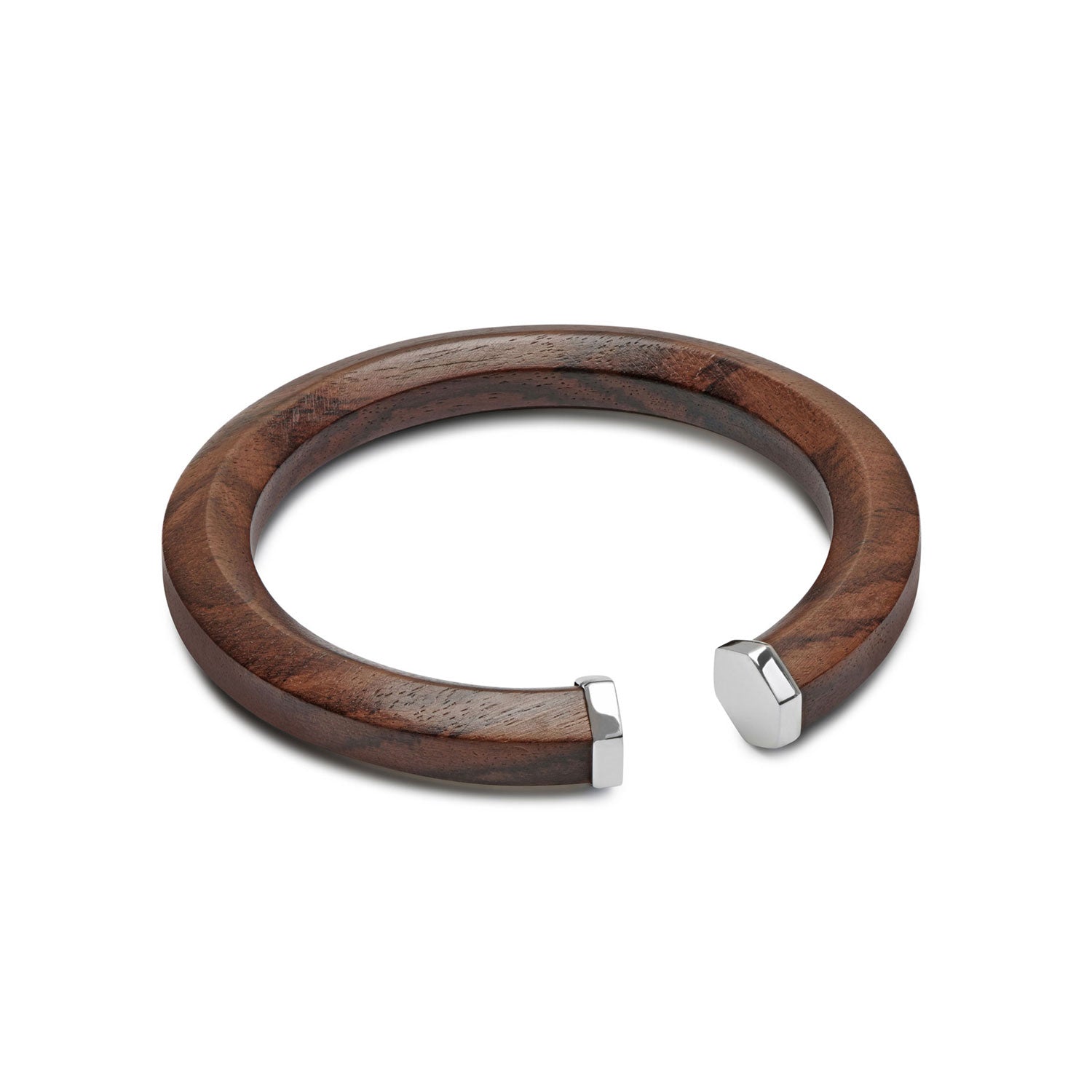 Our Melia wooden bangle is a contemporary brown wood bangle crafted from ethically sourced wood by traditional Balinese artisans. This hexagon-shaped bangle features silver-capped ends for a striking, modern finish.