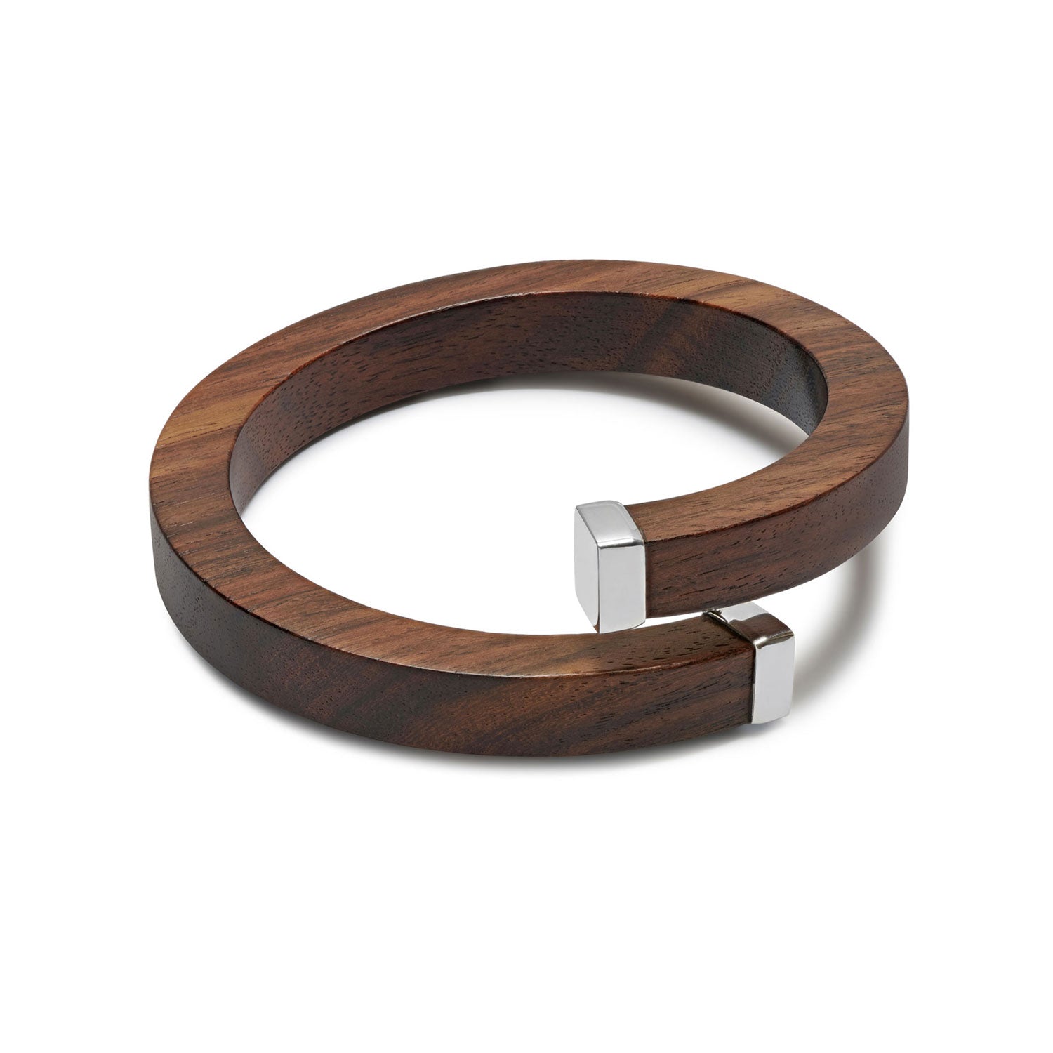 Our Kora wooden bangle is a contemporary brown wood bangle featuring a sleek wrap-over design with polished silver-plated detailing. Handmade by traditional artisans in Bali and designed in the UK.