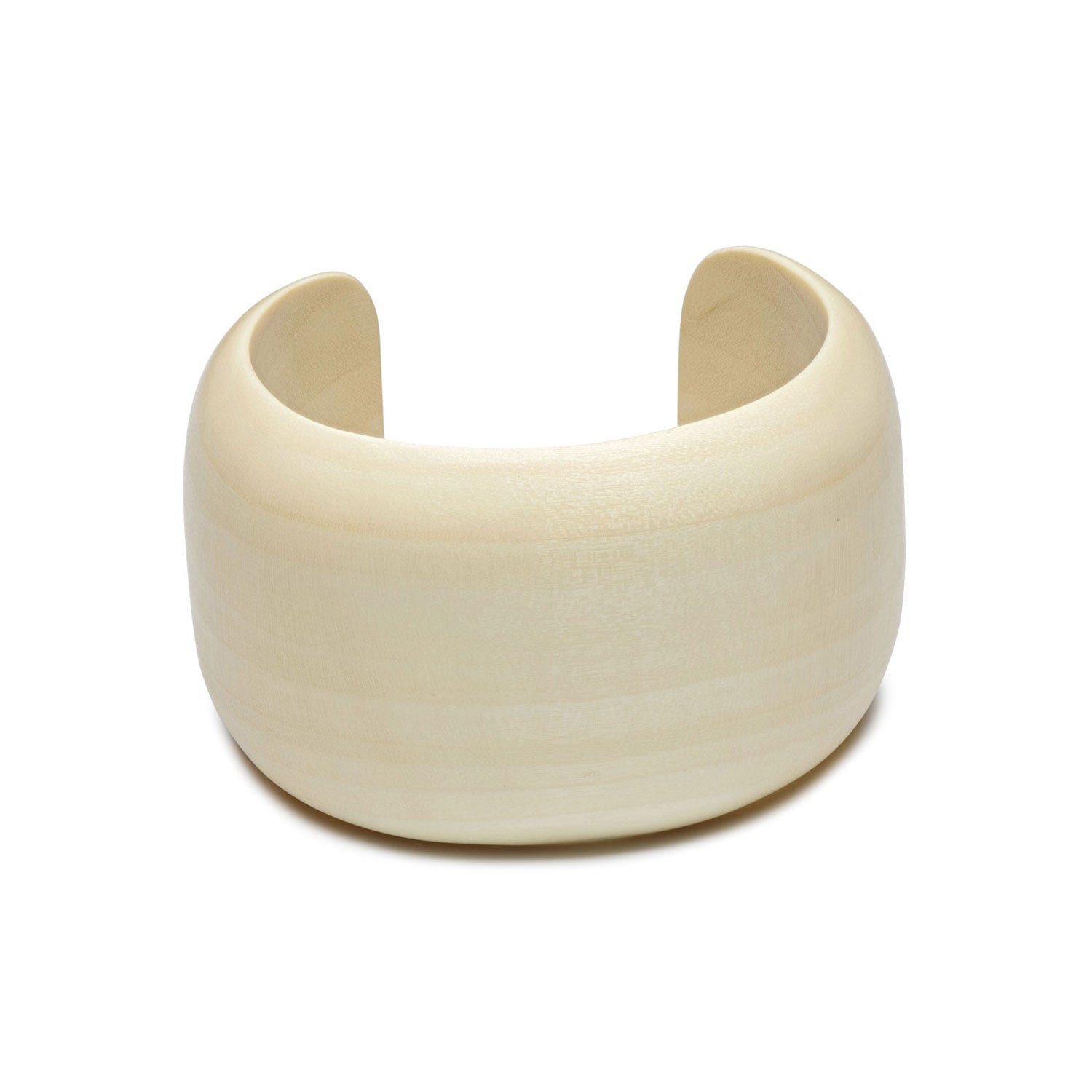 A large white wooden cuff with smooth rounded curves and a minimalist finish. Handmade from ethically sourced wood, this chunky white cuff makes an bold statement and creates a striking look.