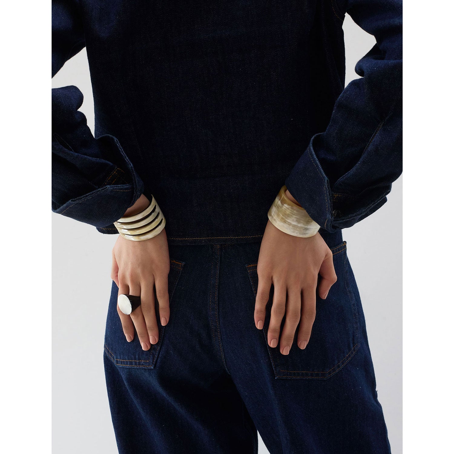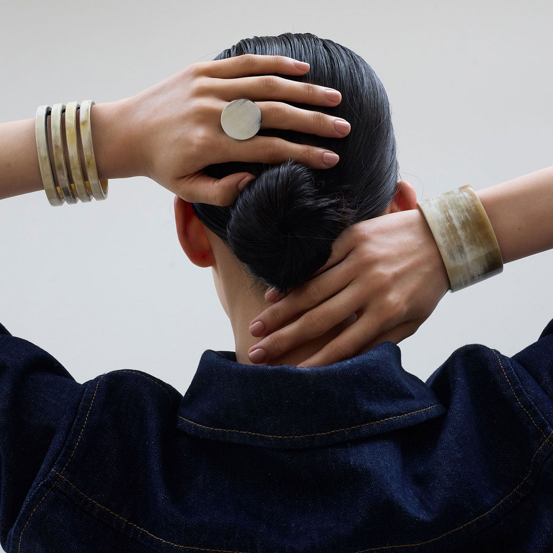 This striking natural horn ribbed cuff is a truly striking piece. It measures 4cm in width but despite its chunky design, it fits very comfortably on the wrist.