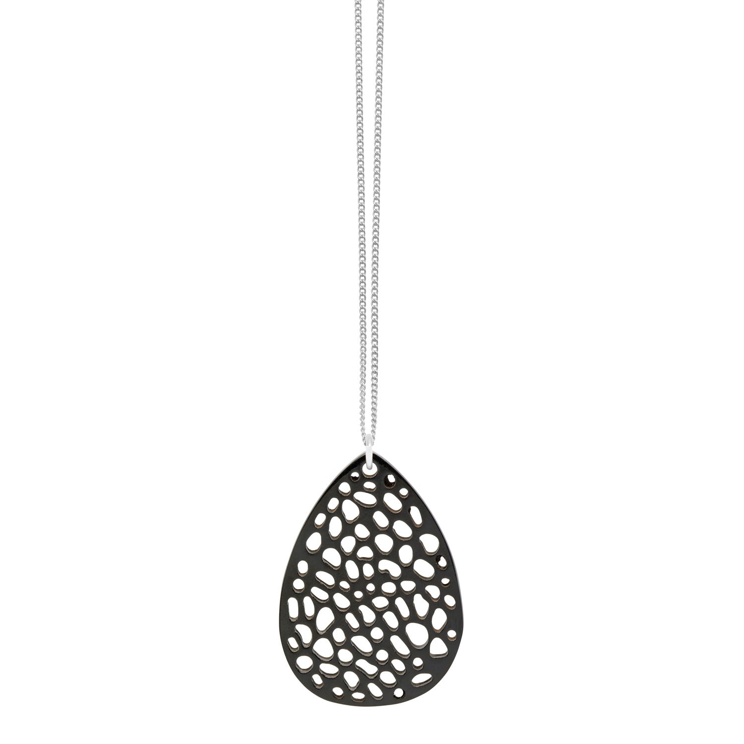 Stylish black and silver pendant necklace featuring a perforated teardrop of natural buffalo horn on an 20 inch silver chain. Ethically handmade by Fair Trade artisans in Vietnam and designed in our UK studio.