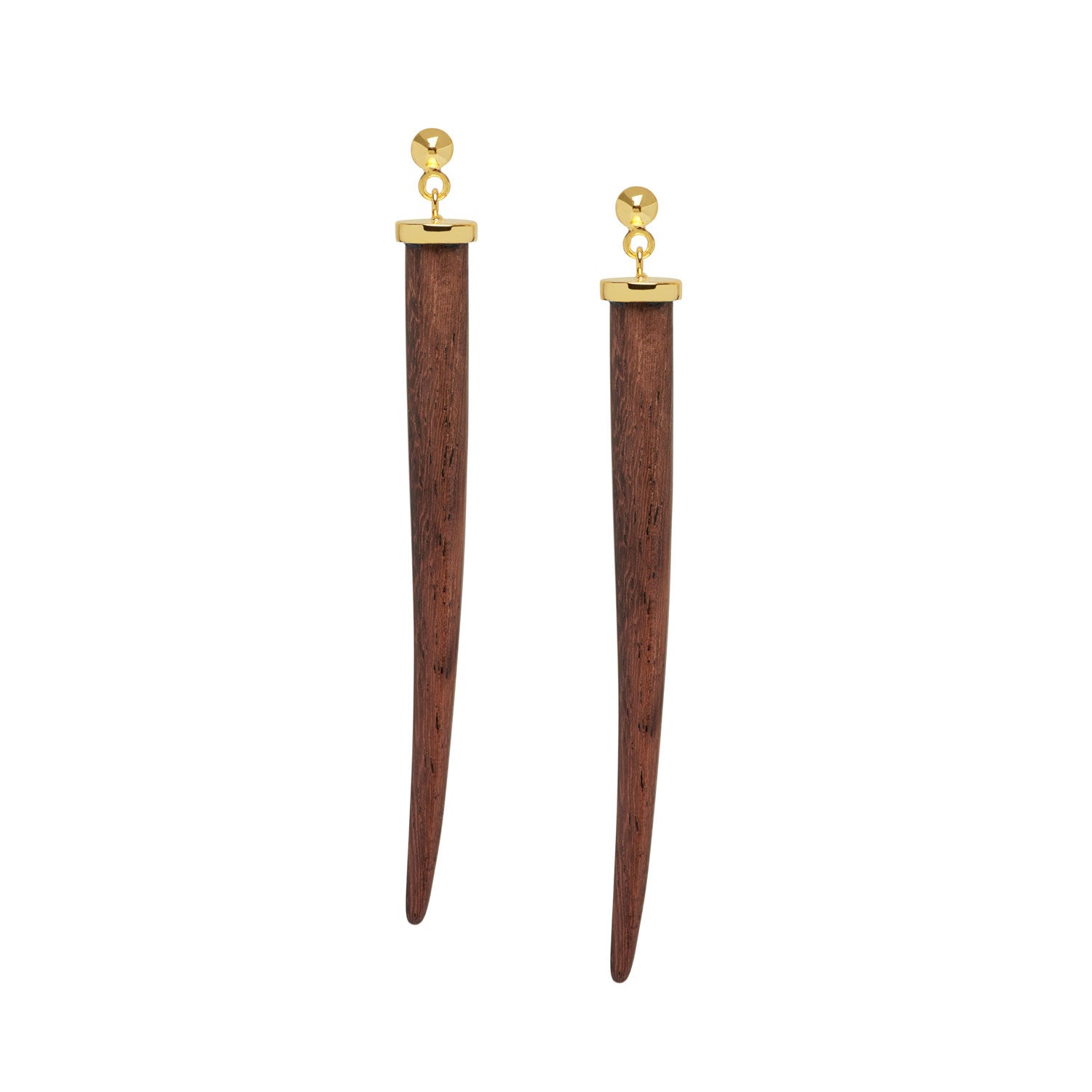 Our Tala long spike earrings have been lovingly handmade from ethically sourced brown wood and set with gold plated sterling silver posts. Designed in our studio in the UK and handcrafted by traditional Balinese wood carving artisans.  These sleek wood and gold earrings are  a true celebration of modern design and traditional craftsmanship.