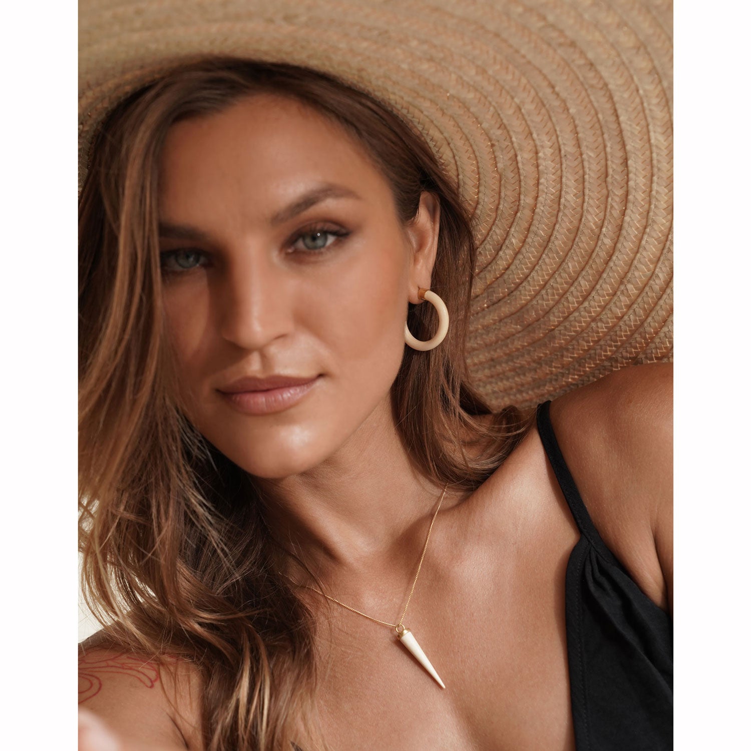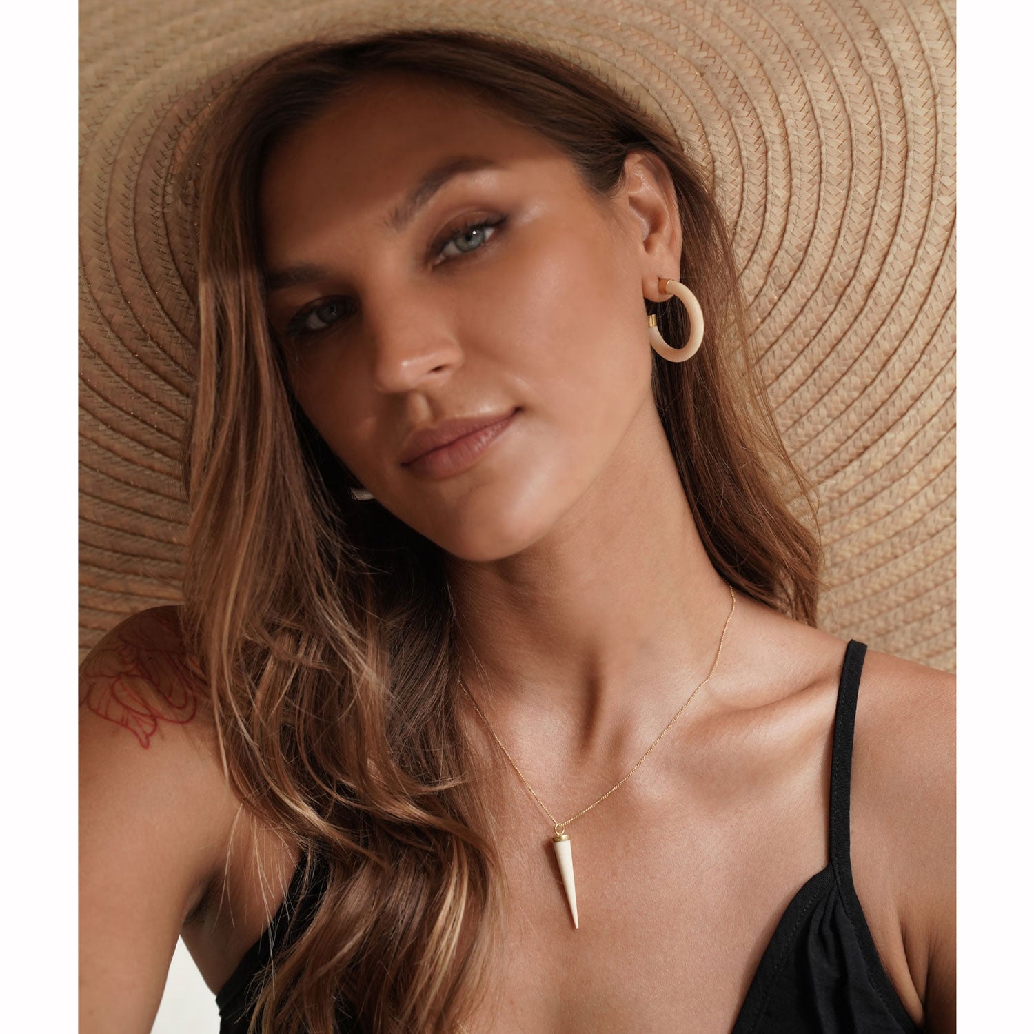 This super versatile rounded spike-shaped pendant looks great worn alone or layered with other pendants and necklaces. 100% Handmade to the highest quality.  White wood has been carved by hand and set with an 18ct gold plated silver setting on a gold plated silver chain.  This piece will look great with any outfit.