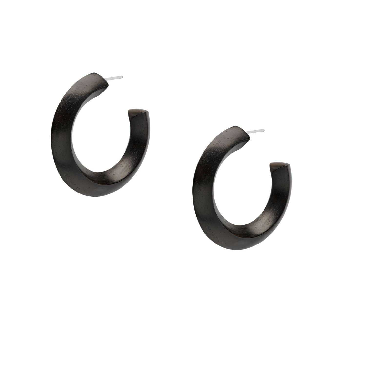 Lightweight, hand-carved black wood hoop earrings. Set with a sterling silver post.