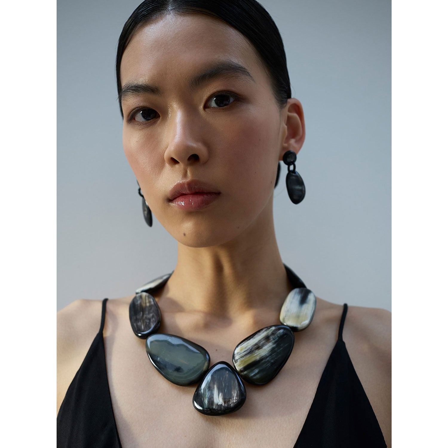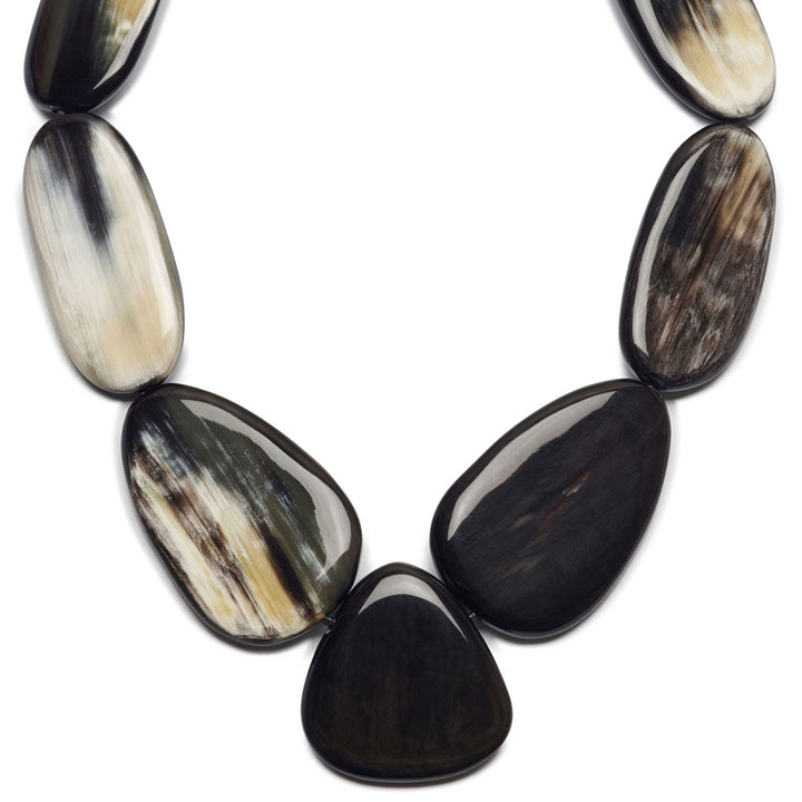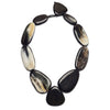 Large Black Natural Pebble shaped horn necklace with ten hand-made horn beads set in black cord.