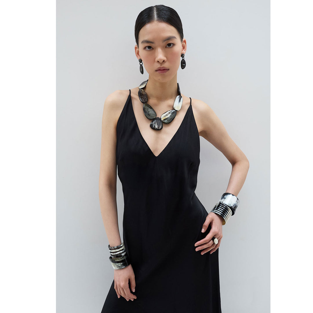This striking black horn necklace is made entirely from a natural material, therefore colourings and patterns will vary from piece to piece, making each cuff unique. This adds to the beauty of this beautiful necklace as no two pieces are ever quite the same.