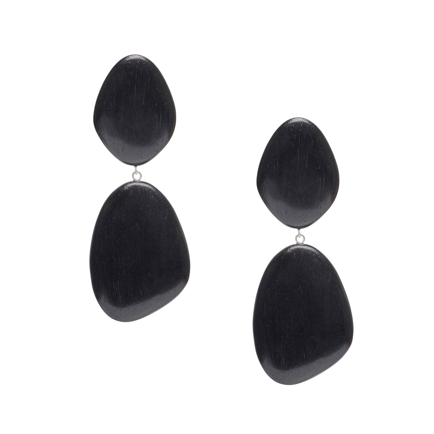 Discover the perfect blend of modern design and artisanal production with our Kailani Handmade Black Wooden Drop Earrings. These oversized statement wooden earrings feature two organic, pebble-shaped pieces of ethically sourced black wood, linked by delicate sterling silver and set on a sterling silver ear post. Designed in the UK and hand-carved by fair trade artisans in Bali from ethically sourced wood.