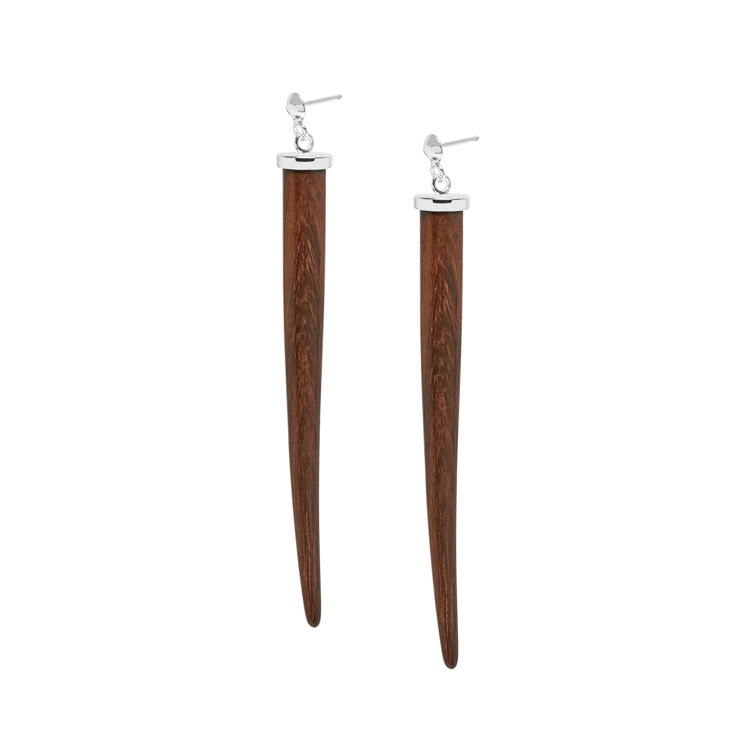 Alt-text for image: Handmade brown wood and silver long spike tusk-shaped earrings in brown wood with sterling silver posts Meta description (160 characters): Ethically sourced wood and silver long spike earrings, handmade by Balinese artisans with sterling silver posts. Unique tusk-shaped brown wood earrings. URL handle: wood-and-silver-long-spike-earrings-brown Web page title: Brown Wood and Silver Long Spike Earrings | Handmade Brown Wood & Sterling Silver Jewelry