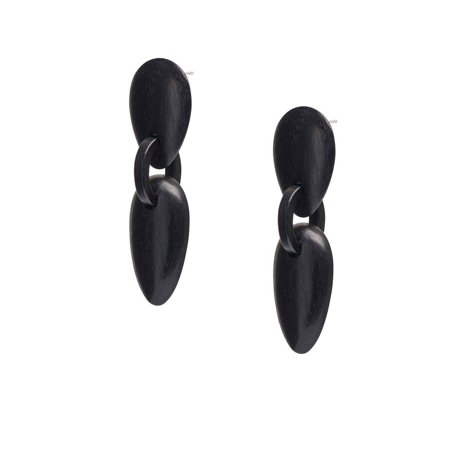 Made from sustainable materials, these stunning Handcrafted Wooden Earrings are designed in our UK studio and brought to life by skilled rural artisans in Bali, each pair championing artisanal traditions and ethical craftsmanship. The design features two beautifully rounded ovals of polished black wood, connected by a delicate wooden link that allows for gentle movement.