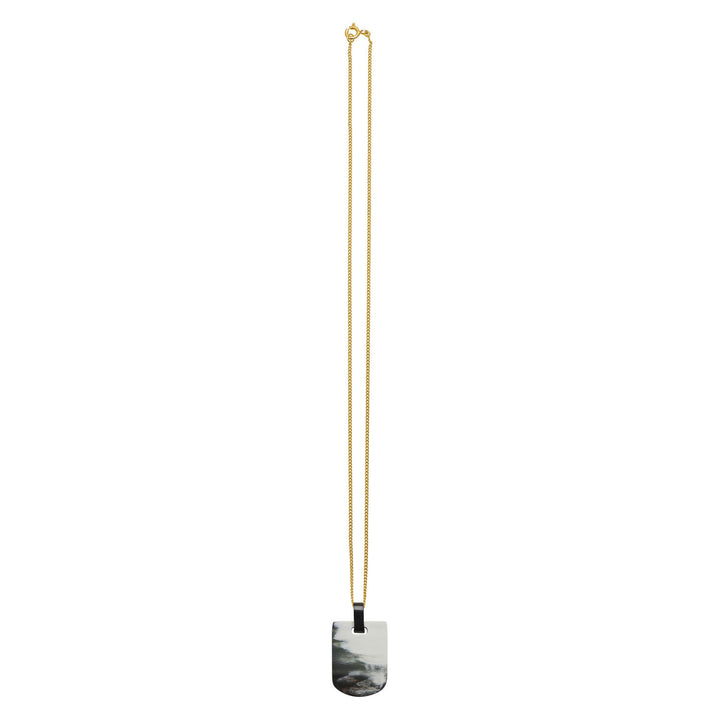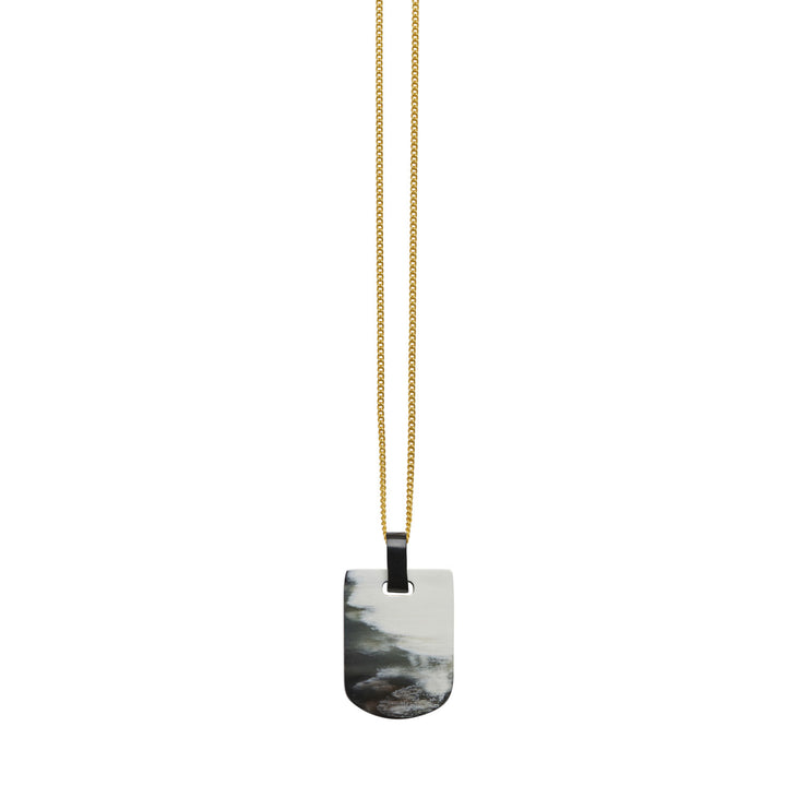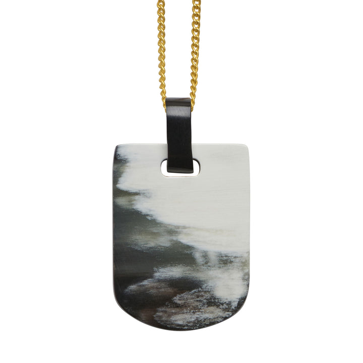 The sleek design brings a modern, architectural edge, while the rich black tones of the horn offer a striking contrast against the warmth of the fine 18ct gold-plated silver 20-inch chain.