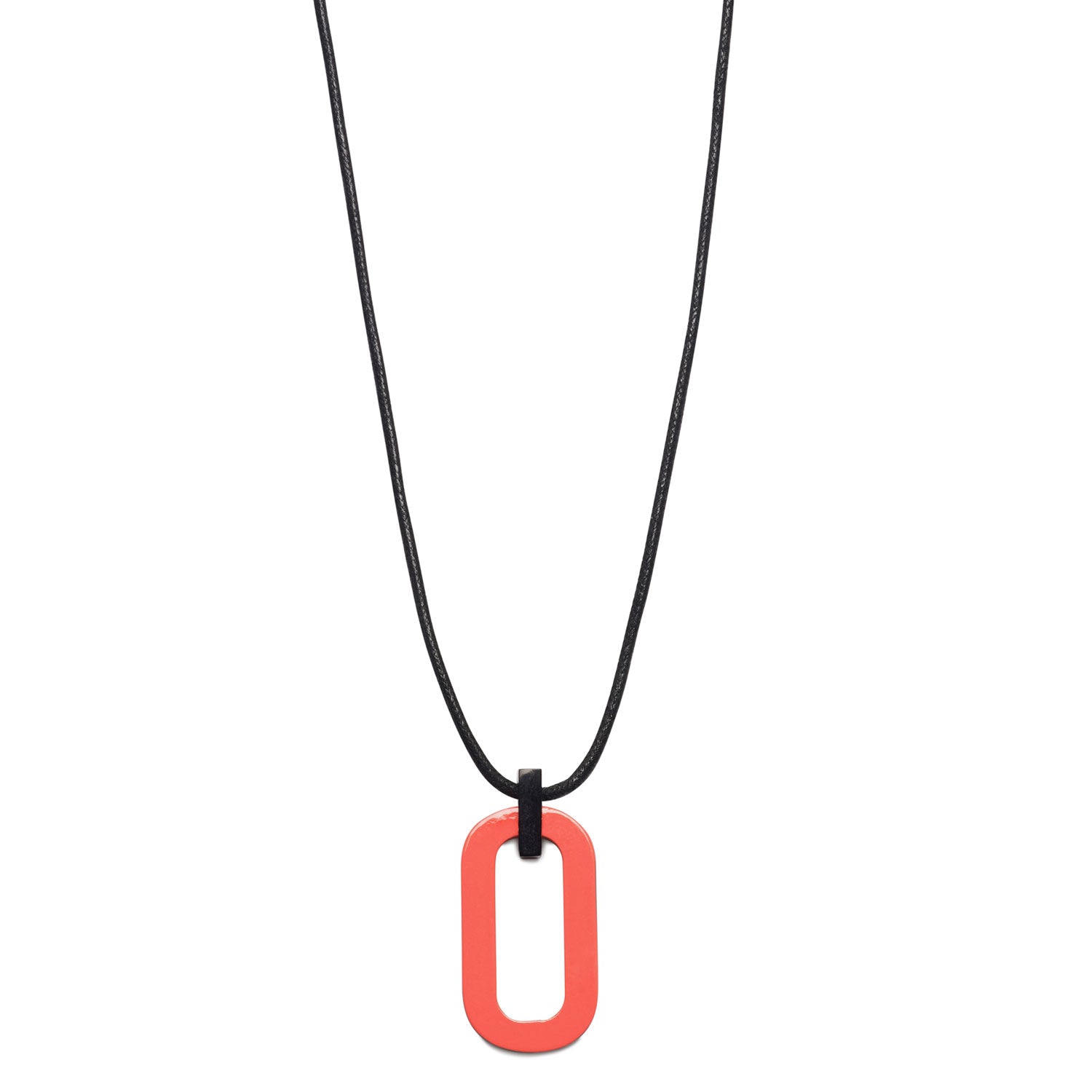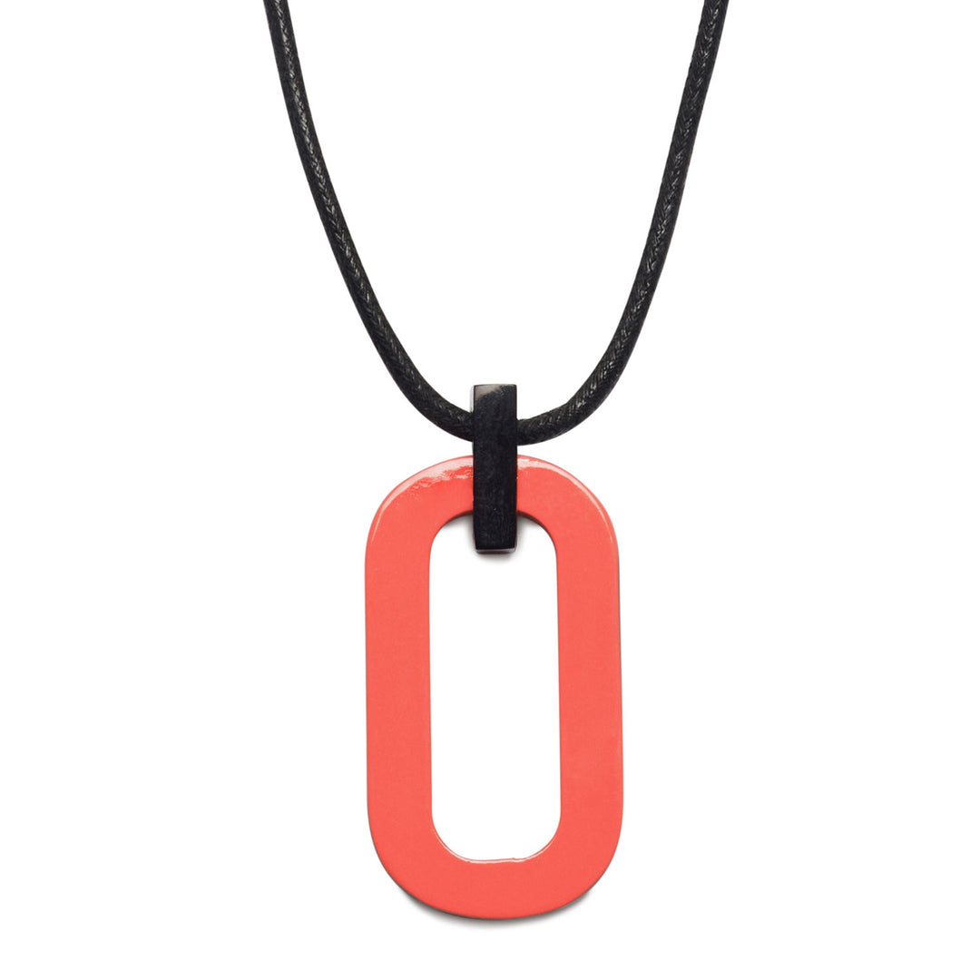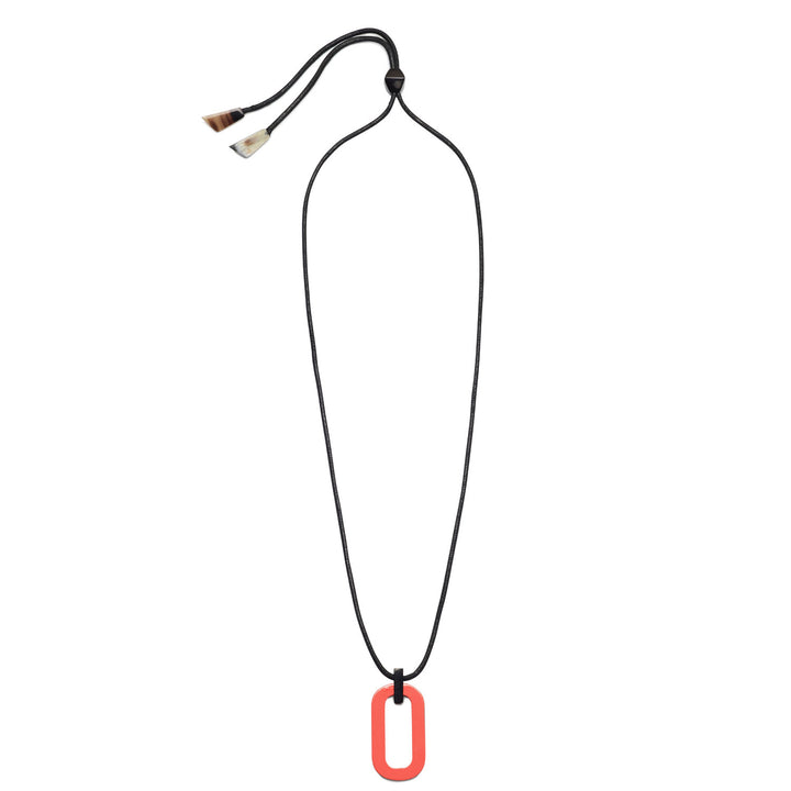 This long Coral lacquered pendant is super versatile and can be worn at any length.  Set with sliding horn beads on the end, enables you to shorten this pendant to the desired length. So depending on your outfit you can adjust this pendant to suit.