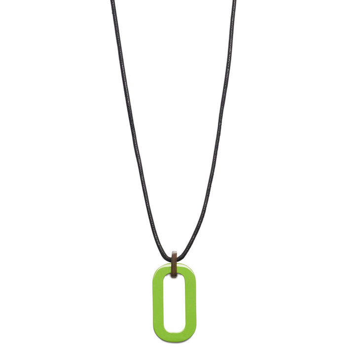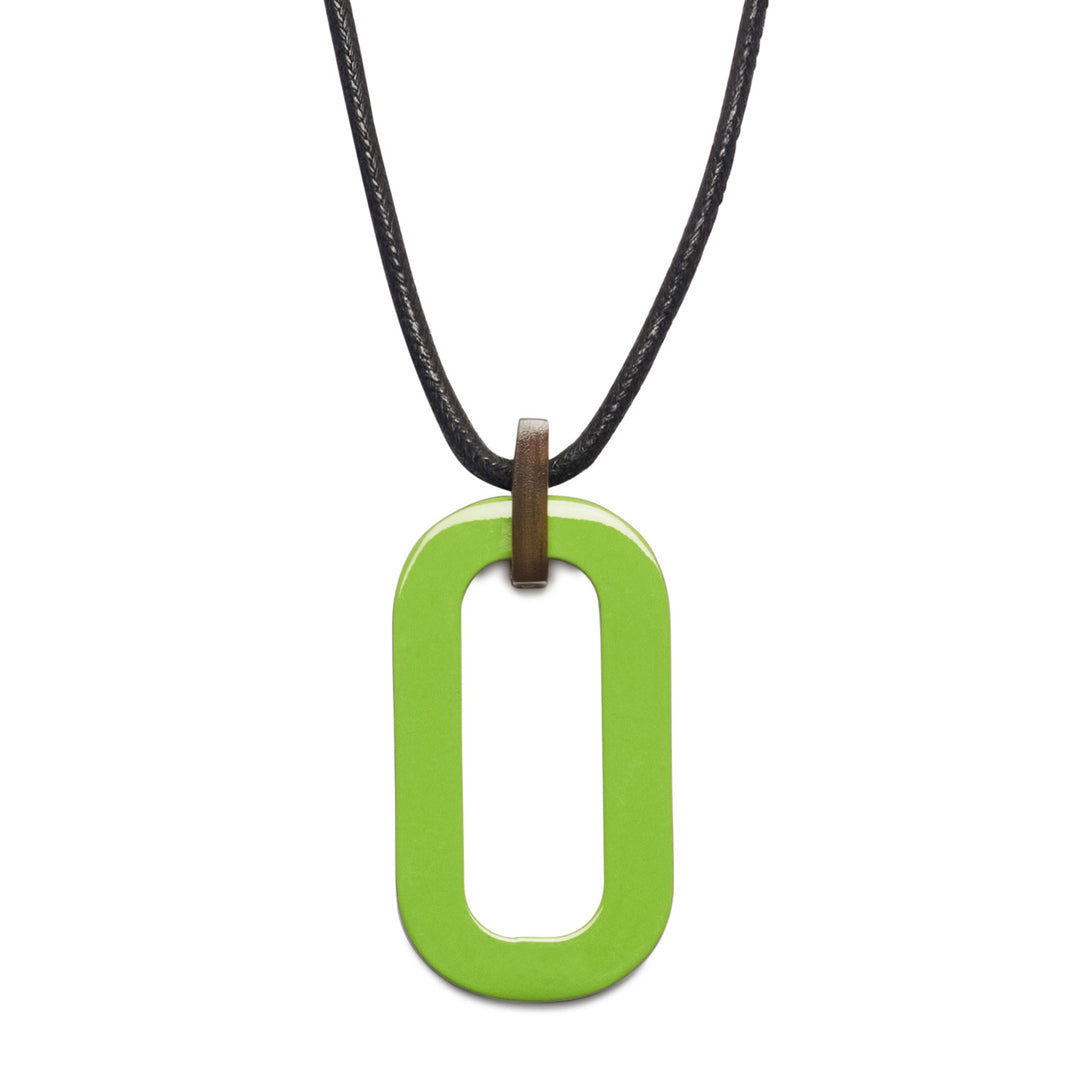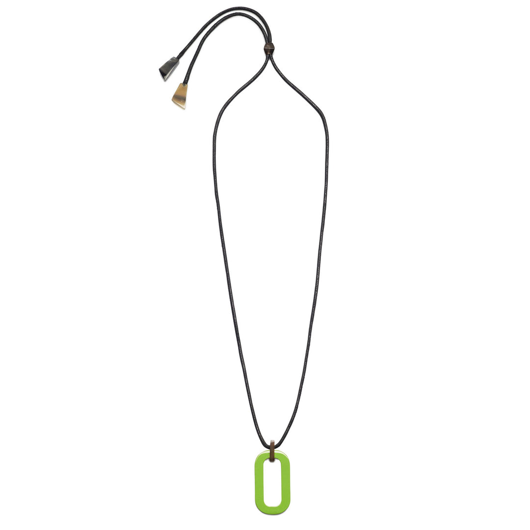 This long Lime Green lacquered pendant is super versatile and can be worn at any length.  Set with sliding horn beads on the end, enables you to shorten this pendant to the desired length. So depending on your outfit you can adjust this pendant to suit.