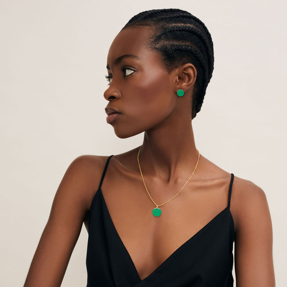 This lovely emerald green lacquered reversible disc pendant is a summer wardrobe must-have.